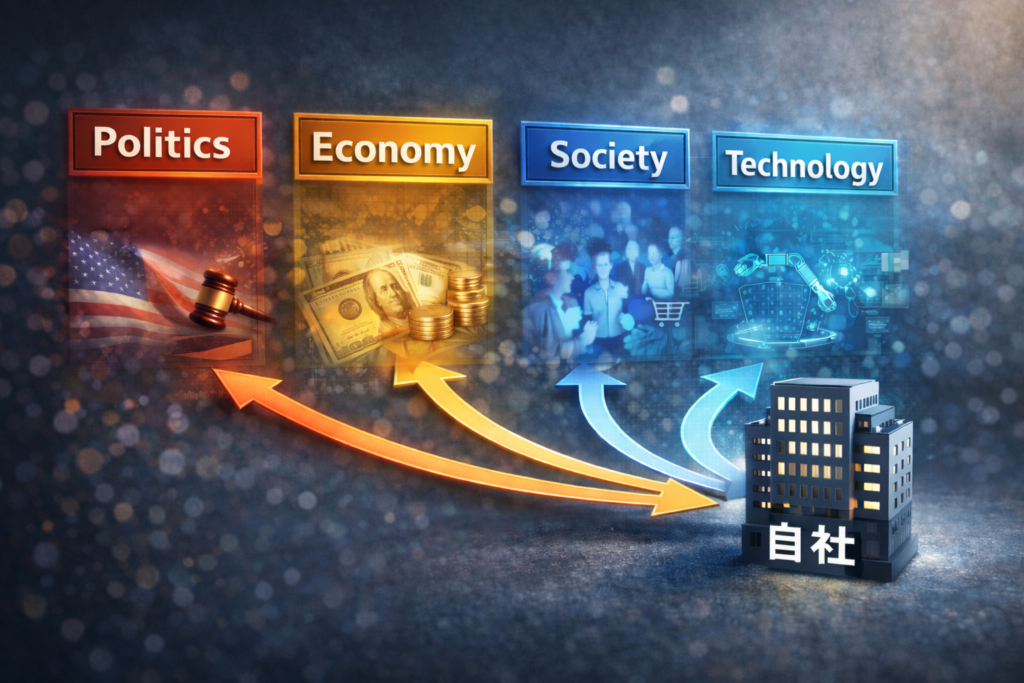 経営を考えるうえで、自社の外部環境をどう捉えるかという問いは、極めて重要です。 市場は日々変化し、技術は進化し、制度や社会の価値観も変わり続けています。特に昨今では、AIや脱炭素、人口構造の変化、グローバルな政治不安など、個々の企業努力では... -